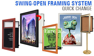Discover our innovative SwingFrames, a unique, USA-patented line of swing open, wall-mounted, and freestanding poster signage and messaging displays. SwingFrames offers a quick, hassle-free way to update your displays, complementing a wide range of interior decor and settings with a variety of metal and wood framing profiles and other design enhancements.