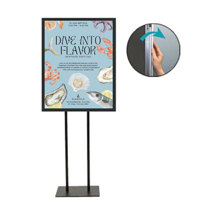 Displaying your 17x23 poster, sign or graphic makes the double pole floor stand a snap to use when it comes to updating your printed insert. It features quick changing, 17x23 snap frames.