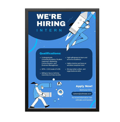 Whether it’s used as a marketing tool to brand your company logo, slogan, organization or some other message, SwingFrame's classic poster display frame with header panel lets you decide what needs emphasis, a great way to make to make a more effective poster display.