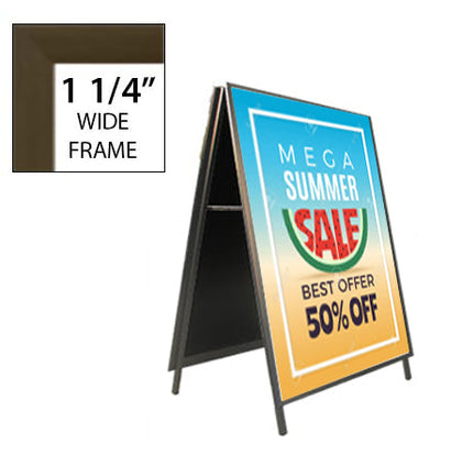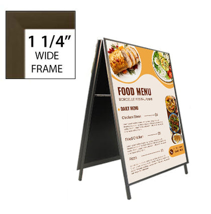 AFrame display stand finishes come in either in Black or Silver. To compliment wide-ranging interior decors, choose from 8 colorful snap frame finishes. Portable and easy to store, the 24" x 30" A Frame Floor Sign Holder Stand easily folds to place onto your desired floor location.