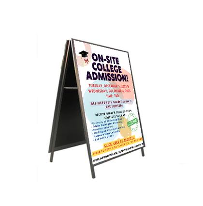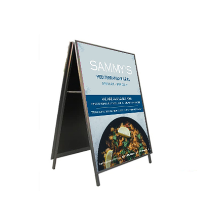 AFrame display stand finishes come in either in Black or Silver. To compliment wide-ranging interior decors, choose from 8 colorful snap frame finishes. Portable and easy to store, the 48" x 60" A Frame Floor Lockable Sign Holder Stand easily folds to place onto your desired floor location.
