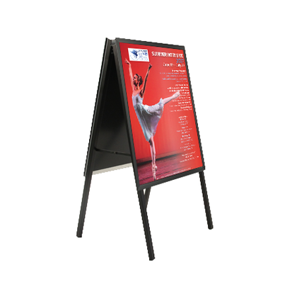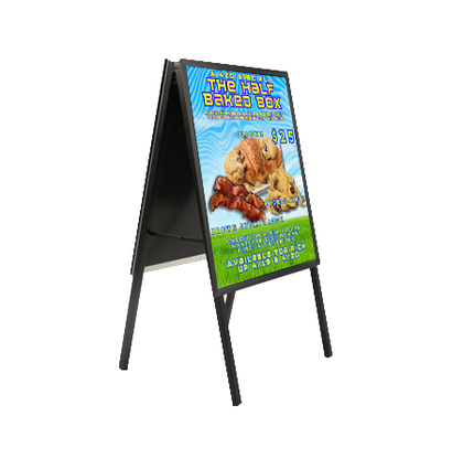 A sidewalk stand sign holder can be used by restaurants, medical offices, libraries, retail stores, theaters, and many other businesses and organizations. Each one has a snap frame that lets you do fast poster changes. All four of the frame rails snap open to easily remove inserts and load the new one into the front. It takes seconds to update signage, so your customers and clients always have the latest info.
