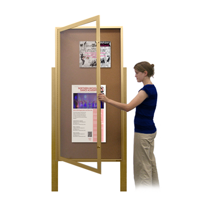 • Floor Stands. A freestanding cork board is an excellent way to grab the attention of people passing by. Floor-standing cork boards are typically used for indoor message board applications. There are also countless uses of standing cork board display cases on posts — and that's not an exaggeration. Restaurants can use bulletin boards to attach lunch and dinner specials. Schools can utilize the two post cork displays and cork board exhibit panels for different classes — the choice is yours. When taking your information outside, enclosed extra-large outdoor bulletin boards are available. Our weatherproof freestanding cork boards let you take your notices outdoors to a broader audience. Each weather-resistant or weatherproof feature ensures your interior materials are shielded from the outdoor elements, so your display continues to look as good as new. For indoor applications, browse our standing bulletin boards on a single pedestal post. These floor stands are slim, making them great for high-traffic indoor locations like retail stores, cafes, and restaurants. A 24x36 freestanding cork board is an excellent advertising tool, as many promotional graphics are printed on paper or posterboard in this size. The 24"x36" poster size is a popular print sheet for many commercial signage applications.