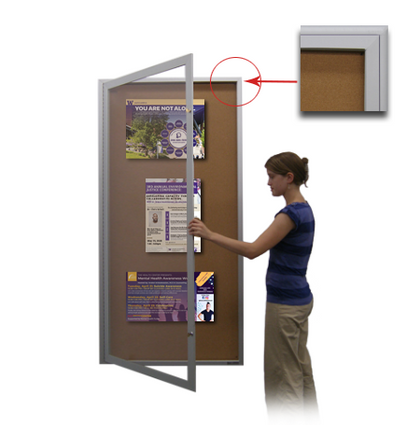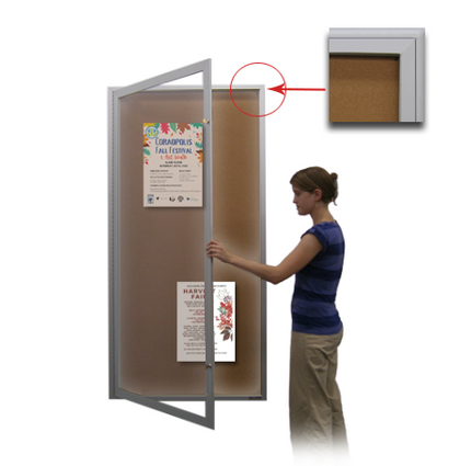 Set up your announcement center inside or outside with the right cork display board. Our outdoor bulletin board displays come in numerous sizes and finishes that will draw attention. Exterior bulletin boards with one door and large bulletin boards with two or three doors are popular options in several models, including message headers and LED lighted cabinet interiors. The displayed contents are secured with front frame cam locks with a break-resistant Lexan polycarbonate clear window. Use push pins or map pins to post your printed materials.