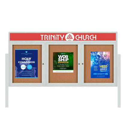 Outdoor Enclosed 96x36 Bulletin Cork Boards with ILLUMINATED HEADER (with Radius Edge & Leg Posts) (3 DOORS)
