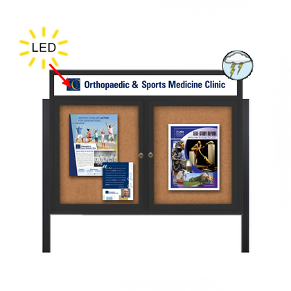 Outdoor Enclosed 48x48 Bulletin Cork Boards with ILLUMINATED HEADER (with Radius Edge & Leg Posts) (2 DOORS)