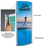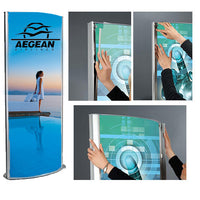 The modern contemporary look is perfect for lighted quick change graphics, with double sided viewing! Dramatic, stylish, elegant two-sided illuminated curved design is on full display for this Totem Floorstand.