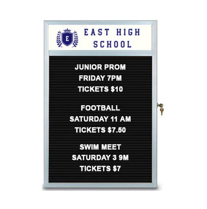 Message Header Panels are featured in 20 letterboard cabinet styles. Order one of these letterboards with a header, send in your message and we’ll print your message for Free, In all CAPS Helvetica Font. Or as an option, you can send in a colorful logo or graphic, different or custom font and we’ll print it for an upcharge. Of course, you can leave the header blank and locally order and print your own Letter Board message header and easily place it in yourself.