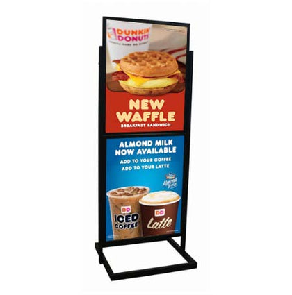 Perhaps you want to advertise a new toy outside of your store in a busy mall. However, it may be difficult for a child to read your sign if it's too tall. On the other hand, you may want your promotion to be visible above a crowd. Our tilted floor stand frames are the perfect solution for reaching your target audience. You can turn your graphic upwards or downwards to match the typical viewing angle of your customers. With double-sided pivoting sign frames available in one to three-tiered options, you can display up to six posters using one poster stand.