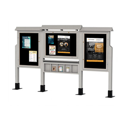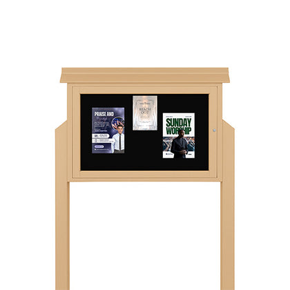 But we know that organizations have a lot of different needs — so we offer a lot of outdoor bulletin boards to meet them. Smaller announcement boards have a single post and cork board floor stands to place by a path or near an entrance. Two-sided outdoor message boards provide double the space. There are message centers with bottom-hinge, top-hinge, side-hinge, and sliding doors. Is one side not enough for everything you have to say? Keep reading for even more possibilities.