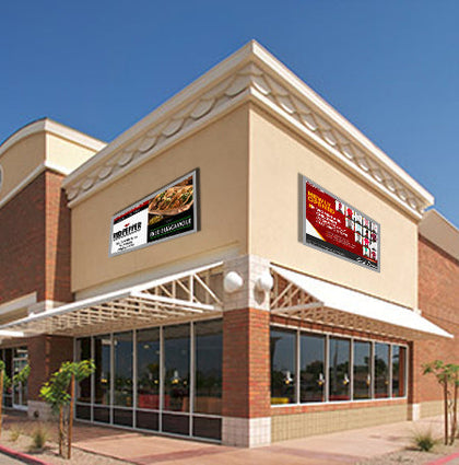 The locations and environments you'll find outdoor displays are endless. Such as; retail stores, cafes and coffee shops, delis, gas station convenience stores, outdoor malls, and shopping centers, school campuses, parks, and recreation centers, sports and entertainment centers, restaurants, hotels and resorts, government agencies, military bases, corporate facilities, medical centers, parking lots, —you name it!.