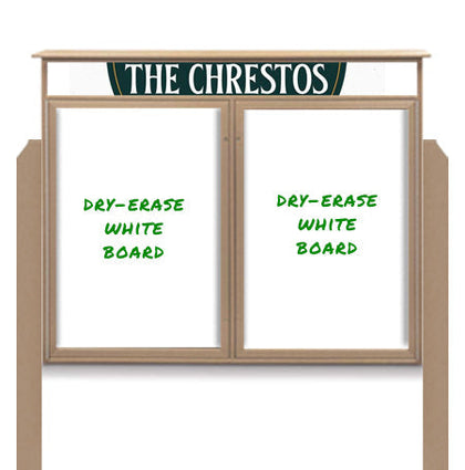• Free Standing, 2 Door Outdoor White Dry Erase Board Message Center with Header