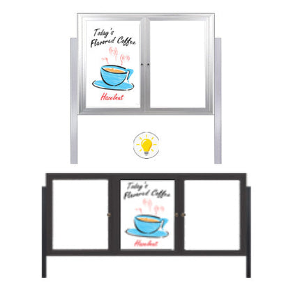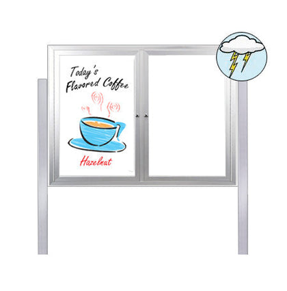 Outdoor Enclosed Dry Erase Marker Board with Posts 2-3 Doors with LED Lights + Black Magnetic Porcelain on Steel Writing Surface 35+ Sizes