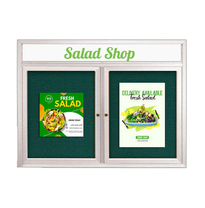 • Outdoor bulletin boards with a message header and lights offer the most possibilities for personalization. Use a header to publicize your business name or brand or to promote a new product. We can print your header text in standard uppercase Helvetica black font for no extra charge. Or have your logo printed using unique fonts and colors. Combine a custom header with LED lighting to produce a stunning display.
