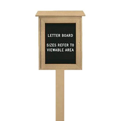 Unlike other exterior real wood framed directories, enclosed letters boards, sign reader boards, and info boards, our free-standing outdoor enclosed letter boards are made with highly dense polyethylene. This recycled plastic lumber is faux wood. It looks like real wood but doesn't act like natural wood. What's impressive about this design is that it's impervious to water, chemicals and will never rot, crack, split or decay. Insects can't destroy it. Both display case and post are built with faux wood lumber making the entire standing letter board tough and durable, weatherproof with long outdoor life.