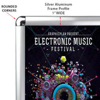 The high quality rounded corner snap frame with 1" wide metal frame profile is quick changing. It typically takes less than a minute to update or change your graphic. Just flip open all sides of the silver metal frame, take out the PET-G anti-glare protective lens, place your graphic, put the lens back and snap the frame sides shut. It's that simple.