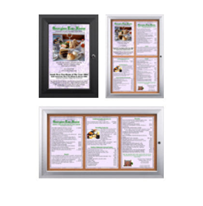 Turn up the lights. We have this wall mount and free-standing outdoor display case on posts in numerous sizes; one, two, and three-door locking cabinets. Combining a message header with an illuminated menu case will get anyone's attention, wherever the location. These are much larger than the typical menu cases, but you can showcase many menus and pin them onto the interior cork board along with announcements, notices, posters, and flyers.
