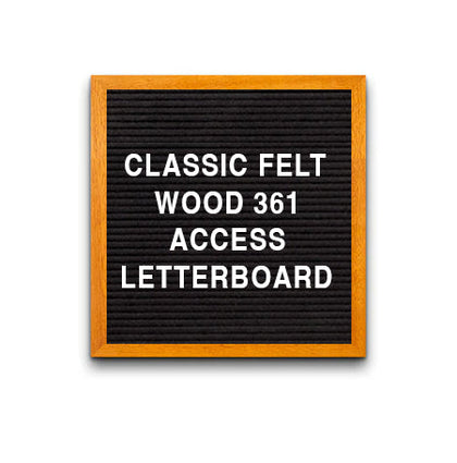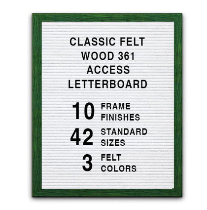 This Access Letterboard™ features a wide 2 3/4" flat frame style face. Natural wood is used to create the 1" deep custom picture frame. Choose from 7 popular wood stained finishes to complement your business, office, or home interiors: Opaque Black, Cherry, White, Mahogany, Honey Maple, Natural Clear, and Rich Walnut.