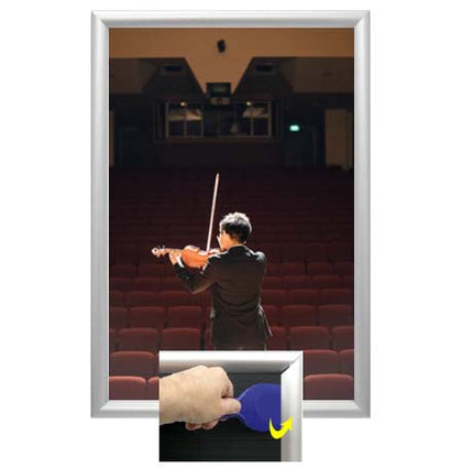 To create more visual impact, take a look at SwingSnaps 2 1/2" wide-edge snap poster frame profile. This is a style that’s ideal for displaying large format posters and graphics. Also create a bold display frame look for small posters and signs. All four sides of the mitered metal snap frames are spring-loaded to "snap-open" to easily and quickly change posters, graphics and signs. Simply snap shut the poster display to get a tight, wrinkle-free poster grip.