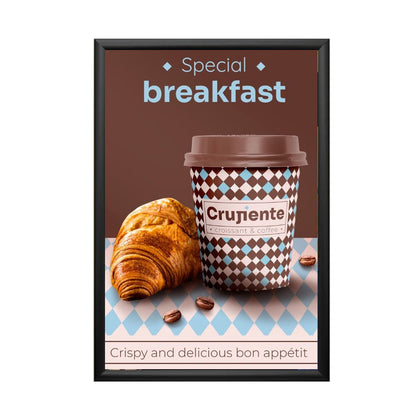 This front-loading aluminum poster snap frame has four mitered corners. It presents a classic picture frame style and comes in 5 finishes that most businesses and organizations buy. It's the best-selling of all the snap frame design types.