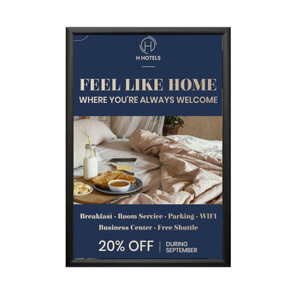 This front-loading aluminum poster snap frame has four mitered corners. It presents a classic picture frame style and comes in 5 finishes that most businesses and organizations buy. It's the best-selling of all the snap frame design types.
