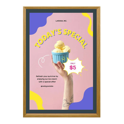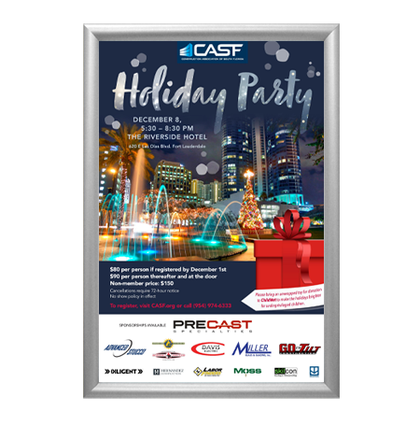 This front-loading aluminum poster snap frame has four mitered corners. It presents a classic picture frame style and comes in 5 finishes that most businesses and organizations buy. It's the best-selling of all the snap frame design types.