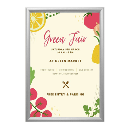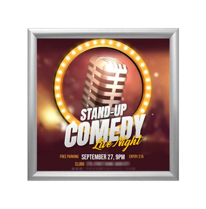 This front-loading aluminum poster snap frame has four mitered corners. It presents a classic picture frame style and comes in 5 finishes that most businesses and organizations buy. It's the best-selling of all the snap frame design types.