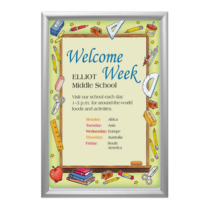 This front-loading aluminum poster snap frame has four mitered corners. It presents a classic picture frame style and comes in 5 finishes that most businesses and organizations buy. It's the best-selling of all the snap frame design types.