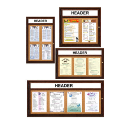 Menu cases with headers attract more attention. Our “Swing Case” enclosed menu display case with header panel frames your 8.5x11 landscape menus with classic mitered corners in beautifully finished wood.
