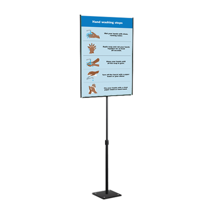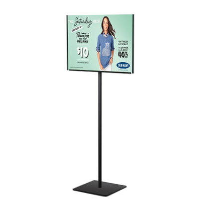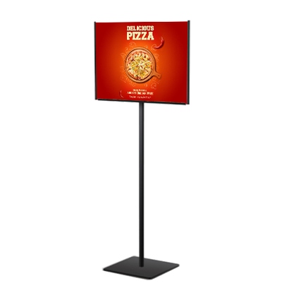 This lightweight Countertop Pedestal Display Stand has an 18" fixed steel post, is double-sided, and holds 11 x 14 signs, graphics, posters, and other signage. The one-sided metal sign holder frame accepts up to 1/16 thick graphics. Choose the frame in portrait or landscape frame orientation.