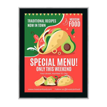 If you are looking for a changeable 13x19 poster holder that provides a bold appealing presentation then SwingFrame's Super Wide-Face Poster Display is an ideal choice. The 2 3/8" slightly curved contemporary metal frame profile enhances the overall look of your printed materials such as advertising material, photograph or sign.