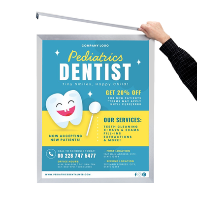 SwingFrame is a popular choice for Businesses, Retail Stores, Corporations, and Institutions that need to change and update sign and poster frames quickly. Featuring hidden hinges and a sliding gravity lock, you can't tell that this classic 16x20 poster frame swings open. It looks like a permanent wall poster frame. It's easy to change your poster or sign. Just swing open the front 16x20 picture frame, place your poster, and swing close. That's it!