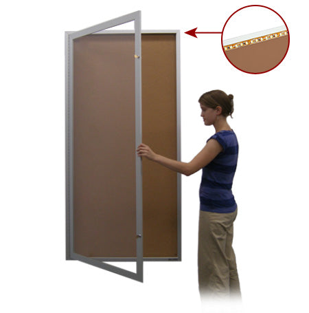 Lighted Poster Cases with cork board are lockable display cases for high-traffic public locations. 24 x 48 "SwingCases" are designed with a continuous hinge on the door and secured with front cam locks to protect your poster.