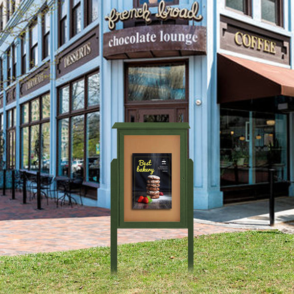 With its Weather Resistant Bulletin Board Cabinet construction and standing tall on two 10 foot leg posts, this 30x36 Outdoor Message Center is ideal for numerous exterior locations including Camps, University Campuses, School Grounds, Hiking Trails, Parks, Zoos, Botanical Gardens, County Fairs, Restaurants, Community Centers and any other location in need of a Outside Enclosed Information Board.