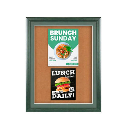 Two door enclosed 48x48 message display boards come in 3 standard wood framed finishes; Walnut, Light Oak, Cherry. You can also add more color to enhance your interior decor: fabric covered cork boards are offered in 10 colors or choose from 4 painted cork colors.