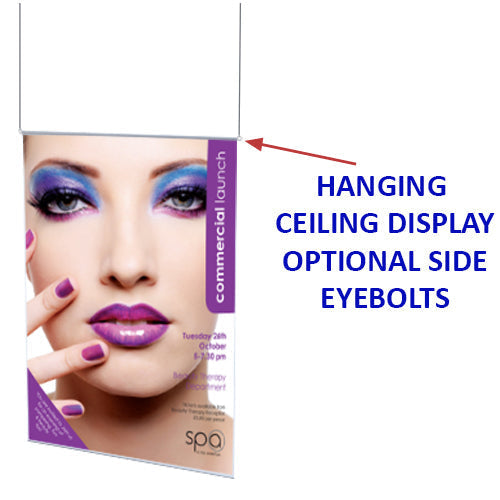 Ceiling Mounted Graphic Bar SignHolders are sold as a set of lightweight aluminum bars. The hanging display mount comes with either a Standard or Side configuration, where the eyebolts are either positioned atop the top crossbar, or off to the sides.