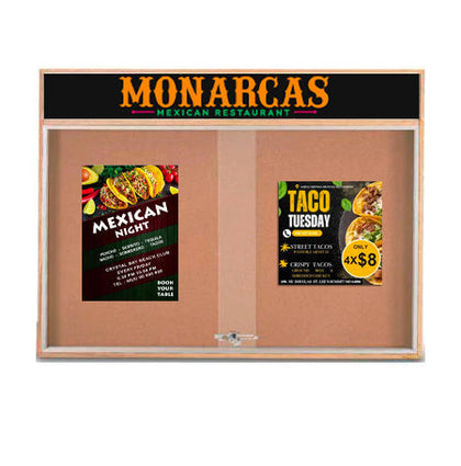 72 x 24 Indoor Bulletin Cork Boards with Personalized Header & Lights (RADIUS EDGE) (2 Sliding Glass Doors)