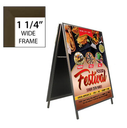Extra Large AFrame display stand finishes come in either in Black or Silver. To compliment wide-ranging interior decors, choose from 8 colorful snap frame finishes. Portable and easy to store, the 40" x 60" A Frame Floor Sign Holder Stand easily folds to place onto your desired floor location.