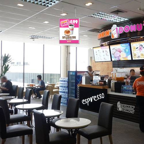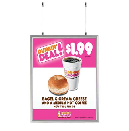 The ceiling-hanging snap frame display can significantly impact sales, promotions, and advertisements. Get views from both sides of the sign frame. This indoor ceiling mount frame is displayed in popular portrait size 22 w x 28 h, with one or two printed sign inserts for single or double-sided viewing.