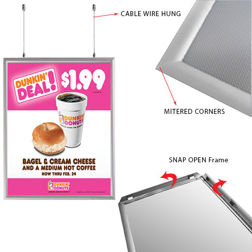 Popular Silver Finish Ceiling Snap Frame 22" x 28" has a 1" wide metal profile with mitered corners made with durable aluminum. And when it's time to update your announcement, changing your graphic typically takes less than a minute.