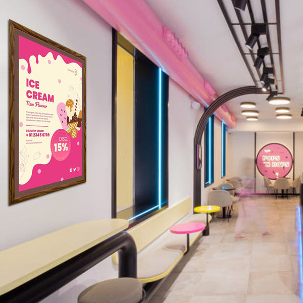 Our same popular SwingSnap poster snap frames with simulated wood wrap now are available with a decorative Mat Board Border. All four sides of the mitered faux wood snap frames 22x34 are spring-loaded to "snap-open". The wall mounted snap frame also described as clip frames or poster grip frames easily snaps down on the Matboard to secure your signage.
