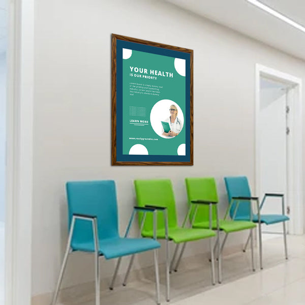 Our same popular SwingSnap poster snap frames with simulated wood wrap now are available with a decorative Mat Board Border. All four sides of the mitered faux wood snap frames 24x36 are spring-loaded to "snap-open". The wall mounted snap frame also described as clip frames or poster grip frames easily snaps down on the Matboard to secure your signage.