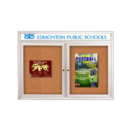"SwingCases" 2 Door Enclosed Bulletin Boards with a Personalized Message Header are wall mount display cases built for indoor applications. With an overall display case depth of only 2 Inches, the slim Radius Edge Aluminum Cabinets meet ADA requirements for indoor public locations.
