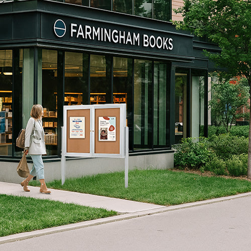 These 2 Door Outdoor Bulletin Board Stands with Posts also come with lights and message header. In addition, 1 Door, 3 Door and 4 Door indoor and outdoor enclosed bulletin boards are available in many styles including radius corners and rounded corners (indoor only). View All Our Bulletin Board Cork Boards