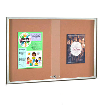 Enclosed in the 50x40 indoor wall mounted bulletin board's corrosion-resistant Anodized Aluminum frame is a self sealing corkboard to pin important announcements, schedules, graphics, signage, office memos, restaurant menus, permits, etc. Your displayed information will be protected by a ratchet lock that secures the two sliding glass doors.