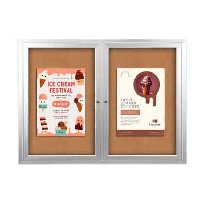 SwingCase wall mounted display case comes with 2 sliding glass doors. With the 60" w x 40" h cabinet size, the large glass creates an unobstructed viewing area and along with its large corkboard interior, this enclosed bulletin board is large enough to accommodate more viewable postings and messages than the typical metal or word framed cabinet doors.