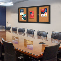Choose from 4 metal framed display case finishes; Black, Satin Gold, Satin Silver and Bronze. Want more color for your 3 door message display board 96 x 24 size? Add fabric covered cork offered in 10 colors or choose from 4 painted cork colors. Order and receive Free Shipping on these 3 Door Cork Board Message Centers.