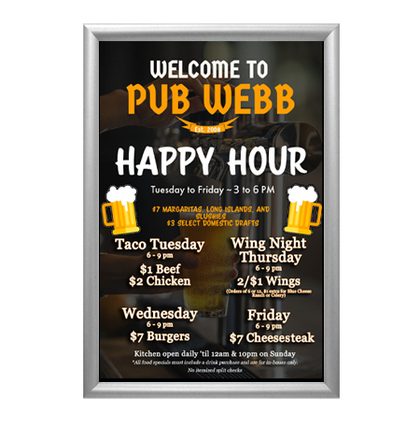 • Quick-Changing, all 4 frame rails snap-open for easy poster changes