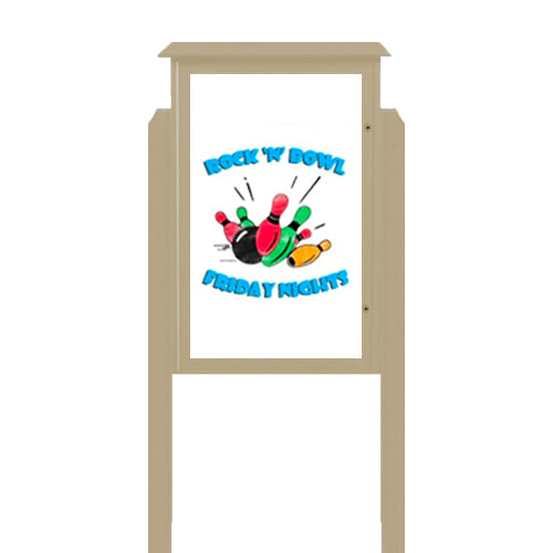 With its weather-resistant cabinet construction and standing tall on two 10 foot leg posts, this 32x48 Outdoor Message Center has a viewing height ideal for numerous exterior locations, including Camps, University Campuses, School Grounds, Hiking and Nature Trails, Parks, Zoos, Botanical Gardens, County Fairs, Restaurants, Community Centers and any other location in need of an Outside Enclosed Information Board.