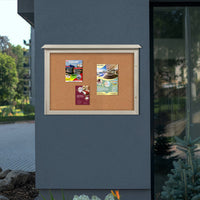The 48 x 36 outdoor display board features a solid, continuous hinge at the top of the cabinet door. The door opens upward from the bottom. A bottom Cam Lock and a break-resistant clear acrylic window on the frame door protect against tampering with the contents affixed to the cork bulletin board surface.